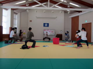 年中から小学生までの親子が協力して飛んだり跳ねたり。